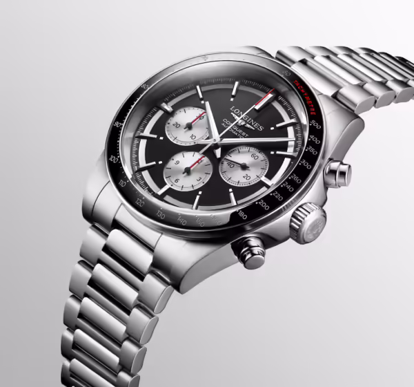Acciaio e lunetta in ceramica, movimento cronografico a carica automatica, quadrante nero e argenté con indici applicati
