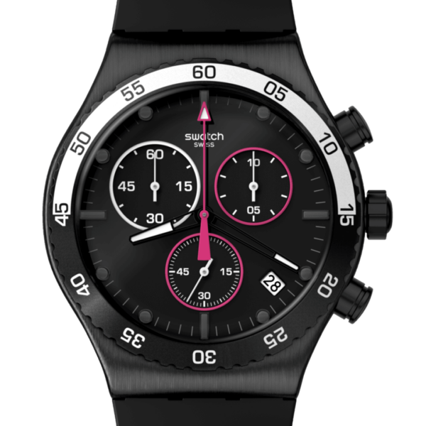 Orologio nero in acciaio e gomma, movimento cronografico al quarzo, impermeabile 3 bar, datario tra le ore 4 e 5, è caratterizzato da elementi che si illuminano al buio, cassa spazzolata con quadrante nero lucente che mette in risalto la lancetta magenta dei secondi e cinturino di gomma