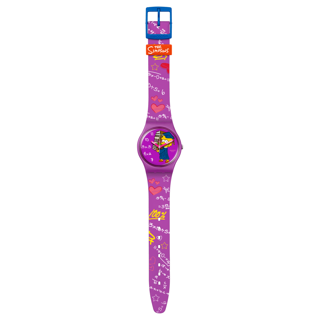 Parte della collezione The Simpsons, questo modello celebra la fine della scuola, raffigurando sul quadrante Lisa con una pila di libri, cassa viola con vetro biosourced, cinturino viola con stampa multicolore, anello rosso con il logo dei Simpsons e fibbia blu scuro